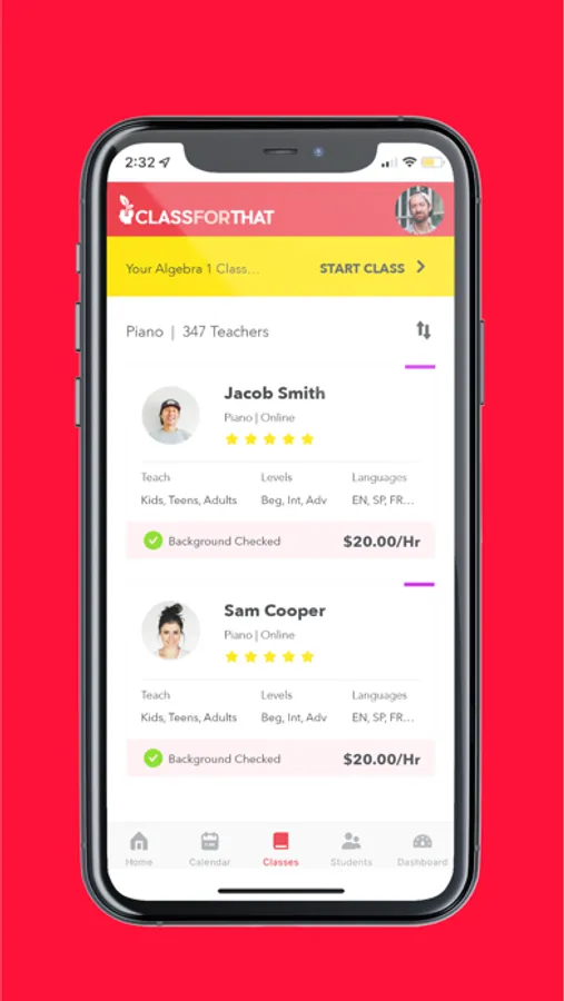 Search for any class and compare teachers based on class format, rating, prices, levels, target audience and languages in which the class is taught. Also, teachers and students will be able to see prior and upcoming classes in their calendar. Teach or take online classes using the app.