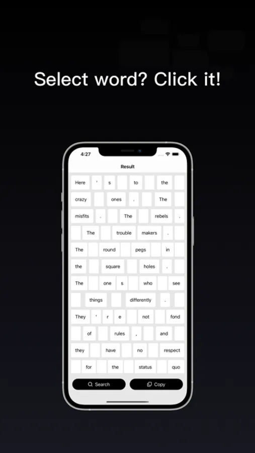 The "Big Bang" was created for this purpose. Through the AI semantic analysis engine, the text is quickly broken down into several words or phrases, which you can copy to the clipboard or search directly in the search engine by simply swiping or clicking.