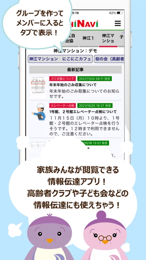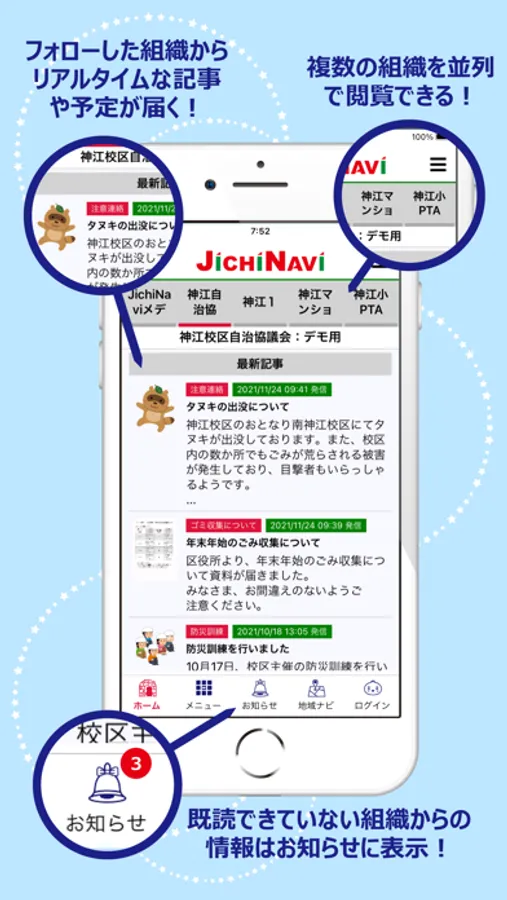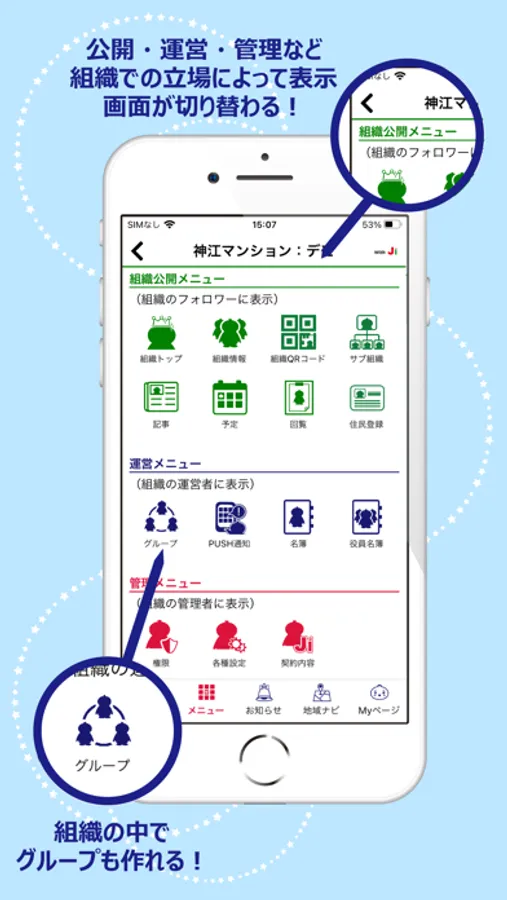「記事」「予定」「回覧」「資料」などの情報発信、「アンケート」「安否確認」などの状況確認、「名簿」「住所録」「権限」などの情報管理、「グループ連絡」「グループチャット」などの連絡機能が搭載されています。