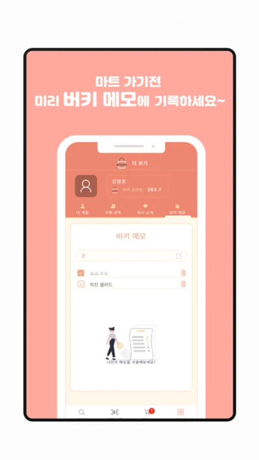 버키를 사용하여 언제든지 쉽게 자신만의 장바구니를 만들어보세요. 메모장에 필요한 상품을 정리해두면 언제든지 찾아볼 수 있습니다.