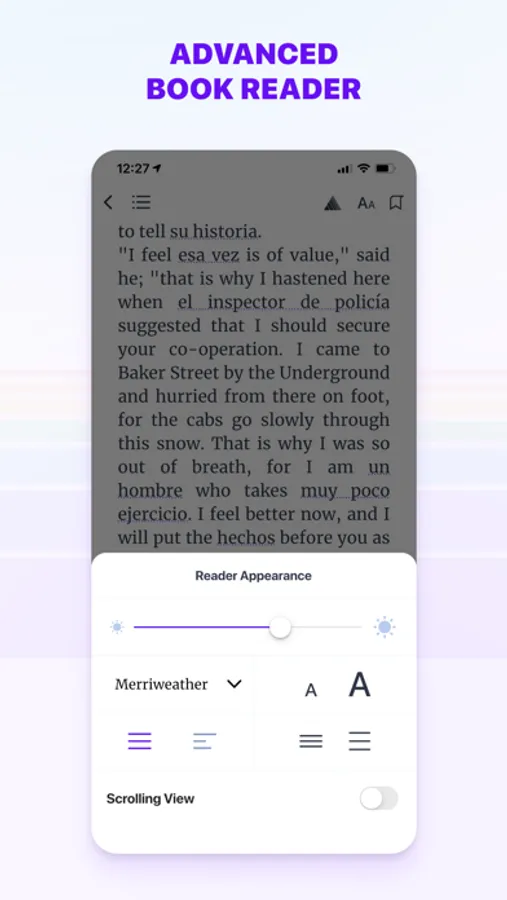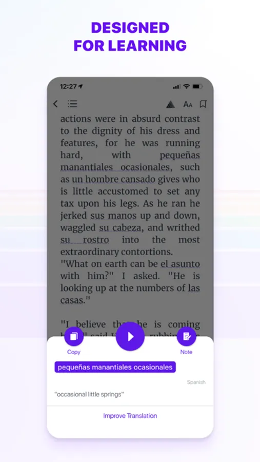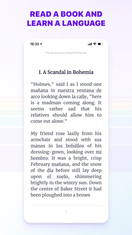 At the start of a Prismatext book, you'll be reading in English. Very shortly thereafter, you'll be reading in English and a little bit of your target language. Prismatext will begin replacing words and phrases with their translations—not too many, of course, but enough for you to notice. If you get stuck, give the words a tap to bring up their footnote: you'll find their meaning there, as well as a way to hear those same words spoken.