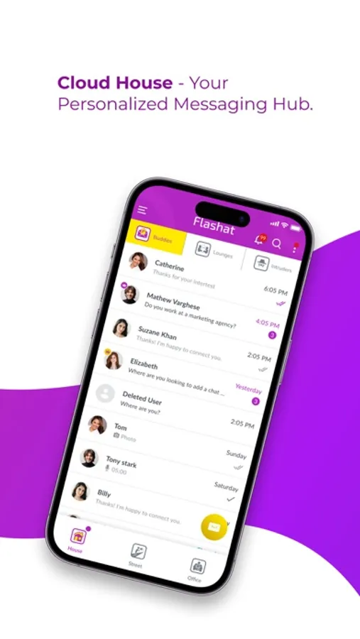 HOUSE: In the Buddies Tab, send and receive private messages to your private circle along with sharing images, audios and videos in complete privacy and security. Start group messaging with your close friends and relatives in the Lounges. And view all your message requests that you have received in one single place in the Intruders.