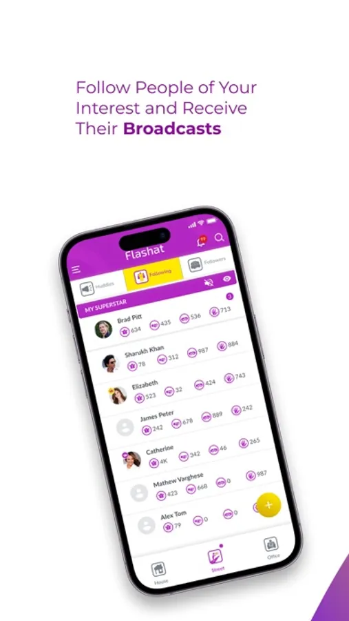 STREET: Explore a more public platform in the Street Tab. Experience wider connections with the public group messaging feature - Huddles. Following Tab will list your SUPERSTAR on the top and all the users you follow will be listed under your SUPERSTAR as your Stars. Followers Tab will list all the premium users who have selected you as their Superstar (Dears), all the free users who have selected you as their Superstar (Fans) and your followers (Likers) who follow you to receive your Broadcasts.