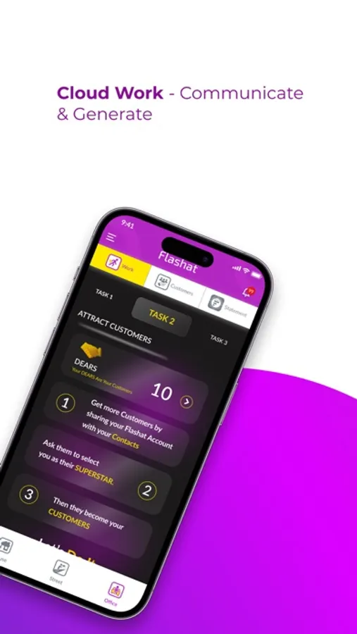 OFFICE: Start your Cloud Business by participating and completing the tasks in the Work Tab. View your Customers and Potential Customers in the Customers Tab. Track your acquired in-app points - Flax in the Statements Tab.