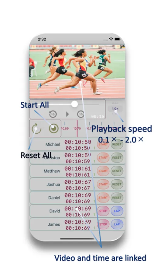 This app was designed to be very simple and to meet the needs of the field. The stopwatch is linked to the video you take, so you can accurately measure the time. You can also measure the lap time.