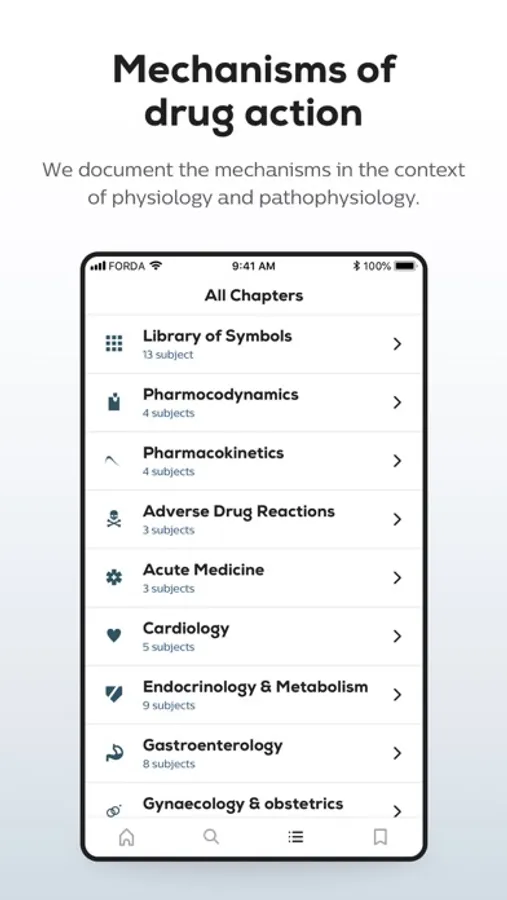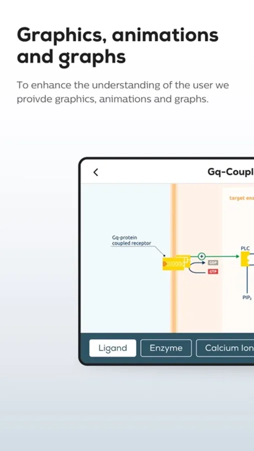 We strive to make this application the best resource for mechanisms of drug action in the context of physiology and pathophysiology by creating each topic in cooperation with an expert from the field. Graphics, texts, questions, and other reference data are provided to enhance the understanding of the user.