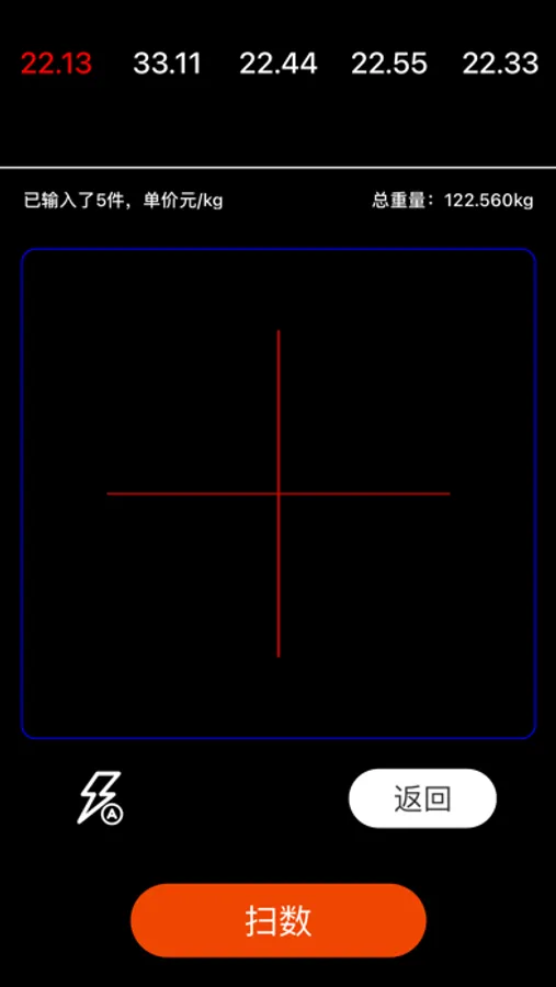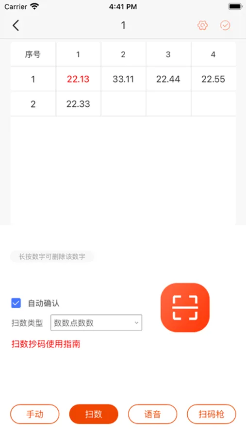软件有四种抄码方式:手动输入,OCR扫数,语音输入,扫码枪输入。扫码枪输入需要您自行购买扫码枪。语音输入建议您慢慢读出数字,多次使用可以提高识别的准确度。扫数输入需要将净重数字尽量对准红色“十字”中心,按下“扫数”按钮即可,如果您的商品无法扫描请联系客服。