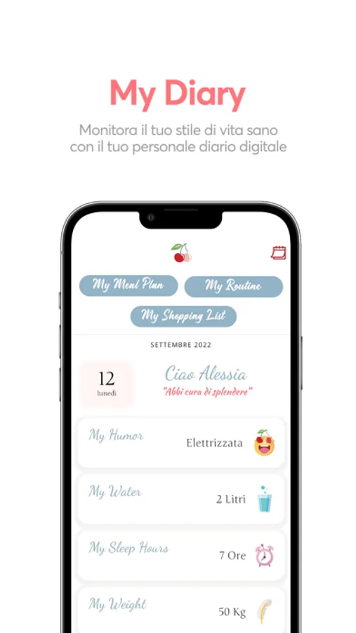 Grazie alla sezione MyDiary potrai monitorare il tuo stile di vita grazie alle molteplici funzioni come: My Routine, My meal plan, My Weight, MySteps, My Cycle and My sleep hours, l’Humor Tracker, My Water e My Shopping List.