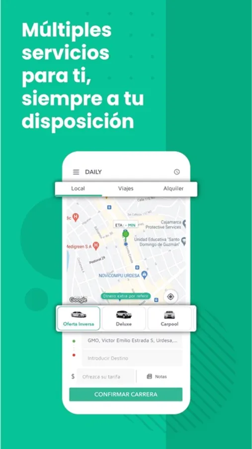 Daily es la mejor opción para movilizarte, sólo ingresa tu destino y listo, un conductor te recogerá en pocos minutos.