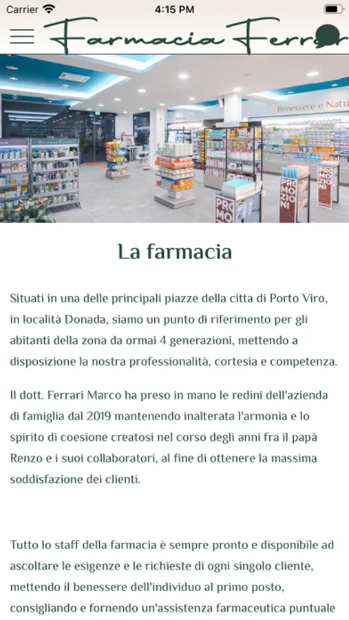 L'App della Farmacia Ferrari di Porto Viro (RO) ti permette di avere i tuoi farmacisti di fiducia sempre a portata di mano con consigli, informazioni, prenotazioni, ordini, richieste di prodotti e servizi in farmacia.