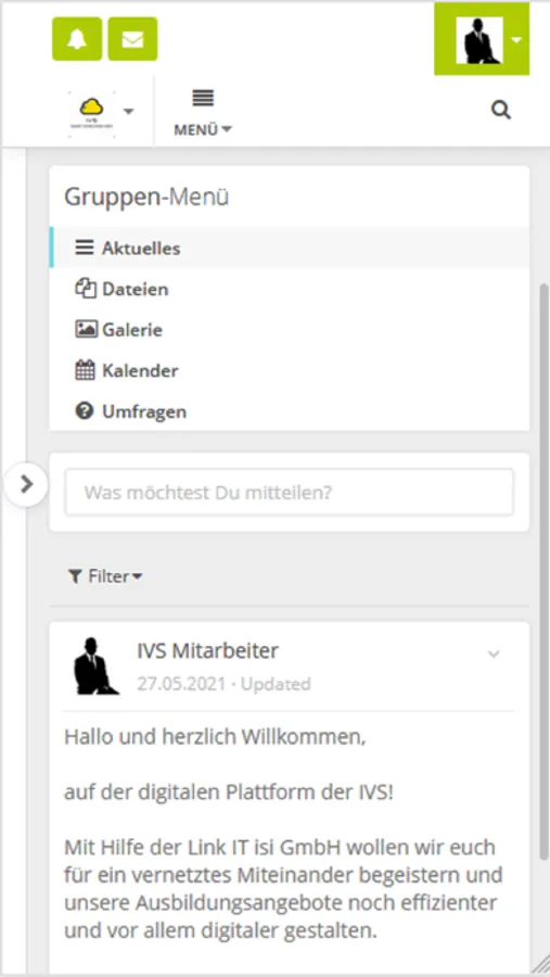 IVS immer verbunden sein ist ein sicheres soziales Netzwerk, dass unseren Mitgliedern eine direkte Kontaktaufnahme ermöglicht. Der Informationsaustausch erfolgt in geschützten Bereichen in Form von Gruppen.