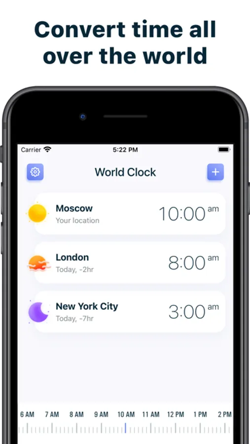 World Clock – time zones converter app. Add the location you want and scroll the timeline to check what time will be there. On the calendar screen, you can easily find common working hours for the selected locations.