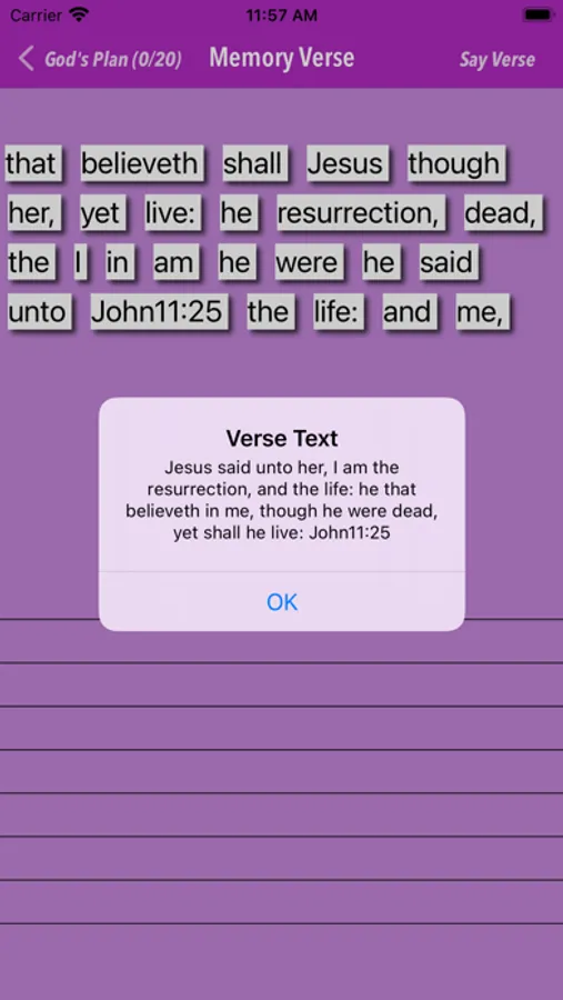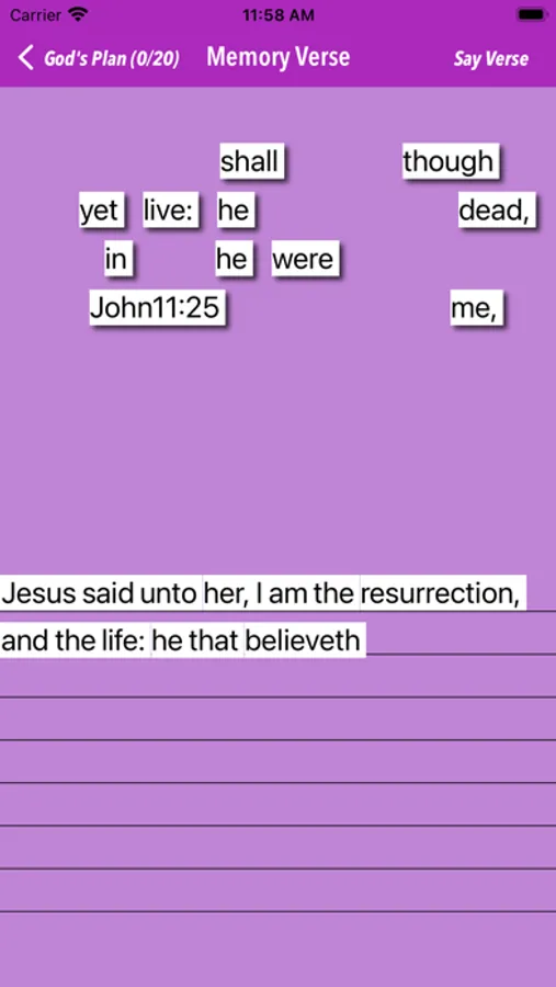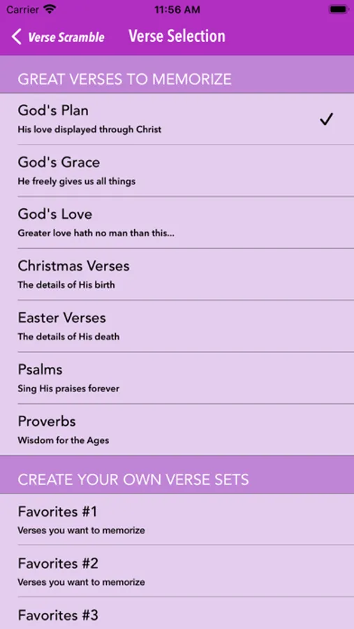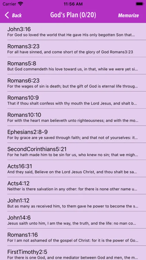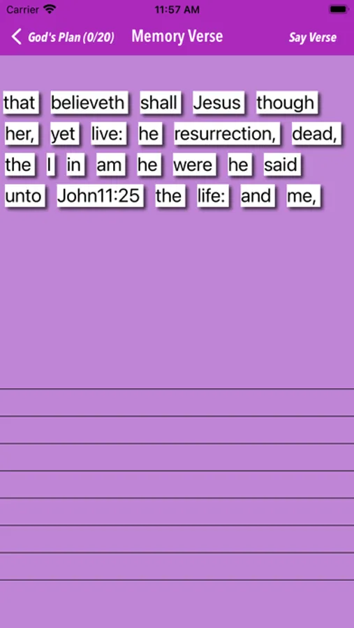 Scrambled Verse is a fun app that helps you memorize Bible verses. Scores display your progress toward completion of each section of suggested verses. You get to select the verse and the app will scramble the words. From memory you select the words in the correct order. If you need help the selected verse can be displayed and spoken to help. Once the entire verse is correct, your score will be recorded. You can create your own lists of favorite verses for memorization. Challenge yourself and friends to improve and increase the number of verses memoized.