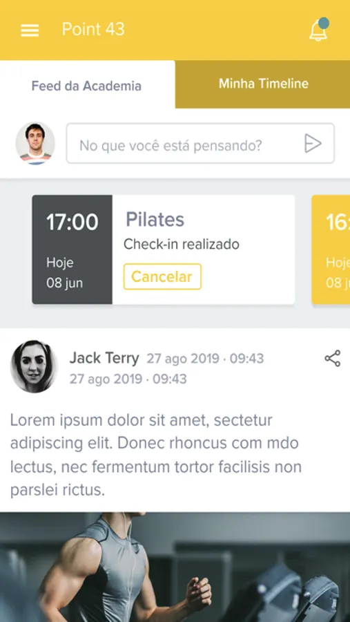 O aluno, através do app Point 43, pode interagir com os outros alunos através da timeline, conferindo, curtindo e adicionando notícias; acessar sua ficha de exercício com histórico de evolução de cargas; acompanhar suas avaliações físicas e fazer check-in nas aulas. Tudo isso na palma de sua mão para deixar seu treino mais dinâmico e interativo.