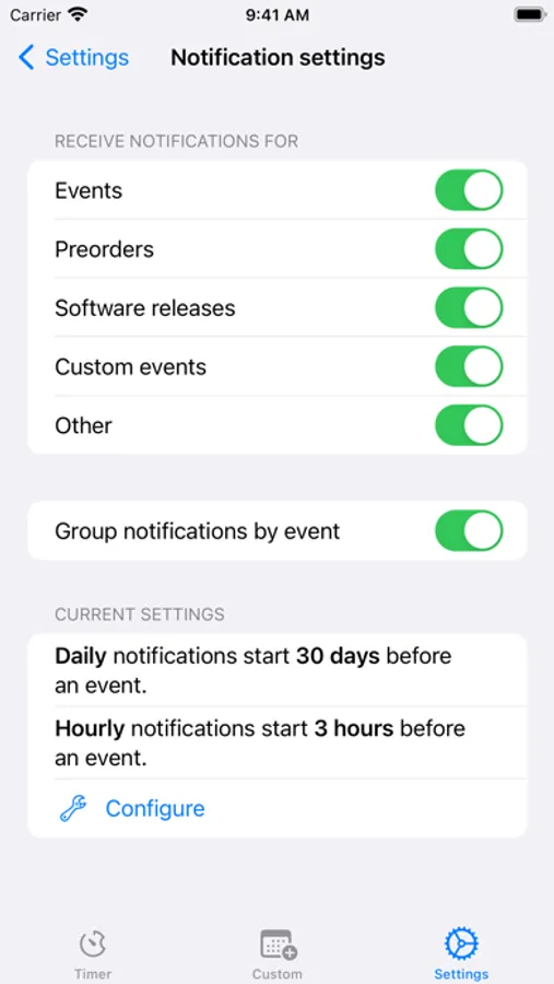 Receive daily and hourly notifications (optional, configurable) leading up to an event on your iPhone, iPad, Apple Watch and more. Mute events that you don't want to receive notifications for.