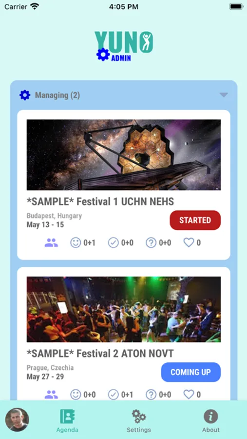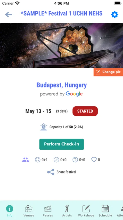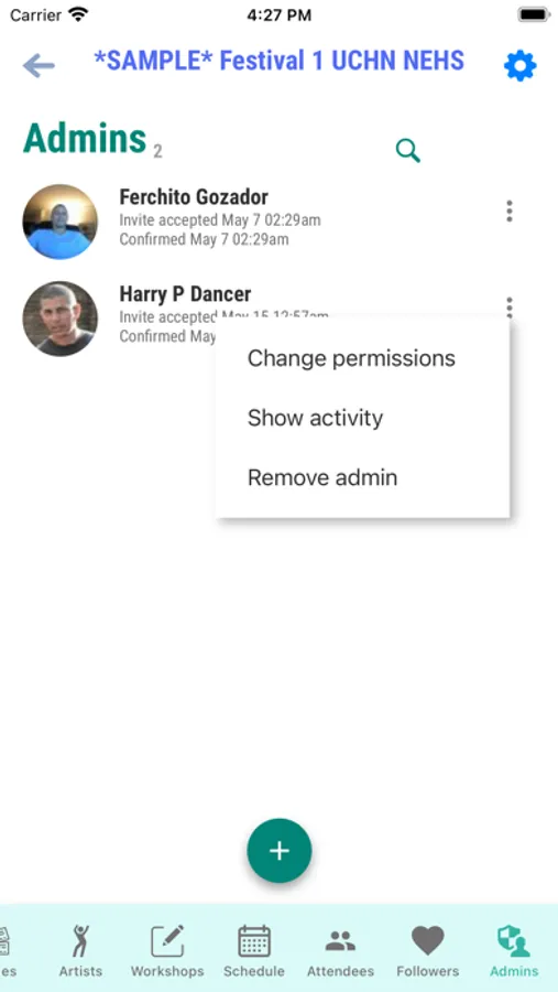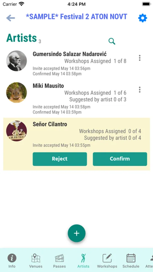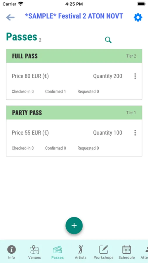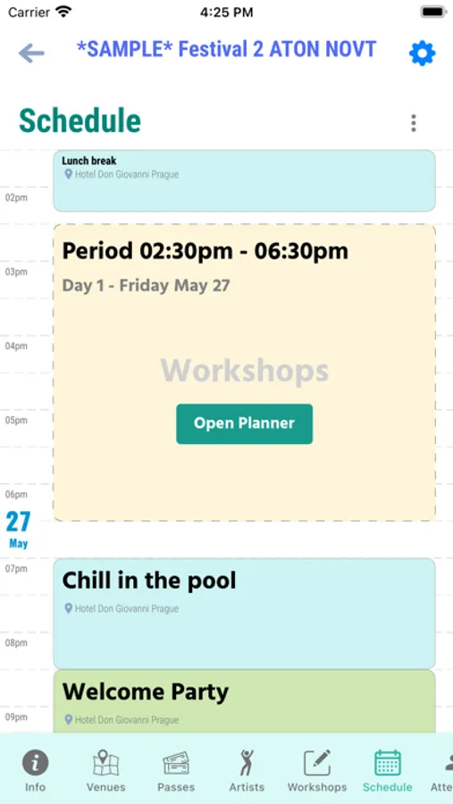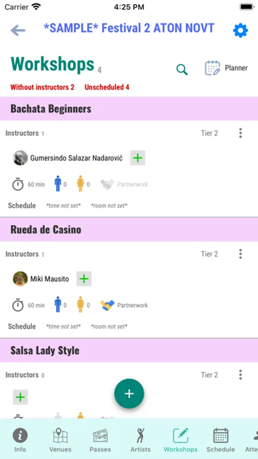 Organize dance festivals including artists and workshops to be offered. Define the schedule with workshops, parties and other activities. Manage groups or single attendees and keep track of festival followers.