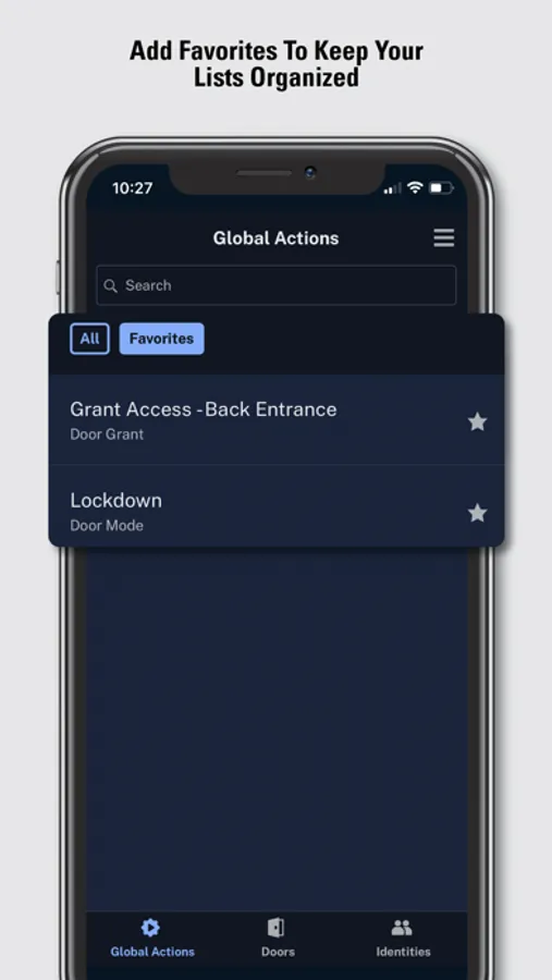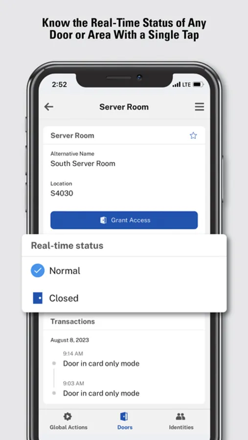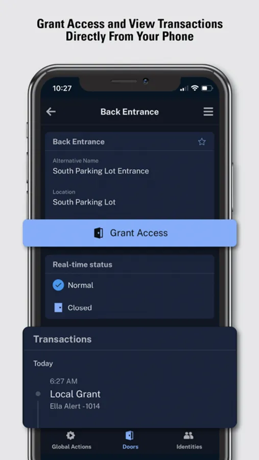 Review the real-time status of any door with a single tap, grant access to authorized user(s) and browse transactions.
