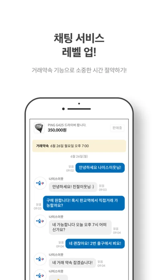 - 골프존마켓이웃 어플리케이션 내에서 실시간 채팅으로 골프용품에 대해 마음껏 대화를 나눌 수 있습니다.