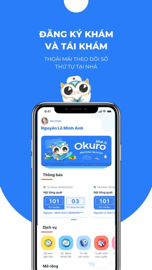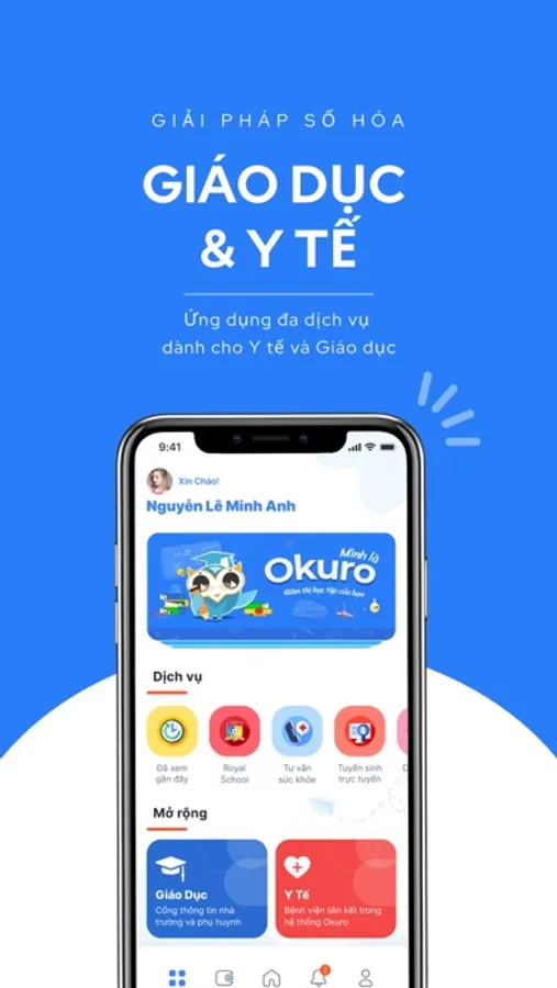 Chào mừng bạn đến với Okuro - Ứng dụng số hóa chuyển đổi công nghệ đầu tiên trong 2 lĩnh vực Giáo dục và Y tế. Chúng tôi cung cấp các tiện ích như đặt lịch khám, thanh toán, đóng học phí, quản lý về sức khỏe và việc học cho con em và gia đình.
