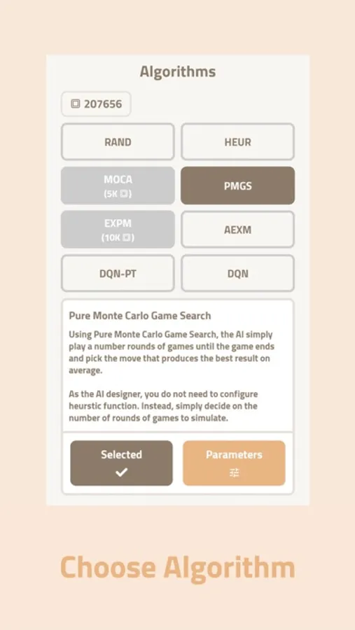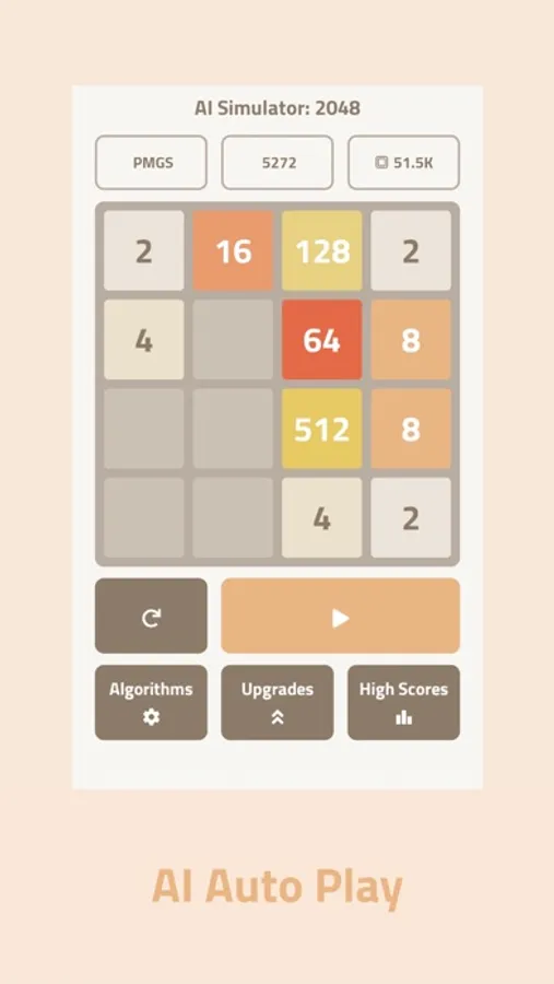 No more swiping. Let the AI play the game for you. Progress through the 2048 game by unlocking more advanced algorithms and machine learning models. Choose from Basic Heuristics, Monte Carlo Simulation, Pure Monte Carlo game search, Deep Q Learning (DQN), and many more to be added.