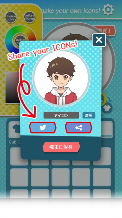 You can also customize the hairstyle, facial expression, eye color, and hair color. Let's have fun sharing and creating icons with your friends!