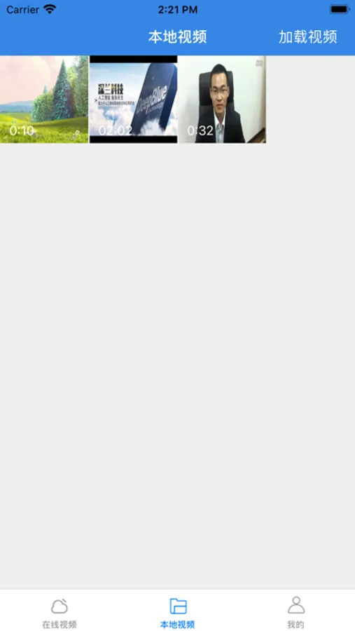 1、本地视频播放,本应用在启动时会加载本地视频文件,带缩略图,点击直接可以播放。