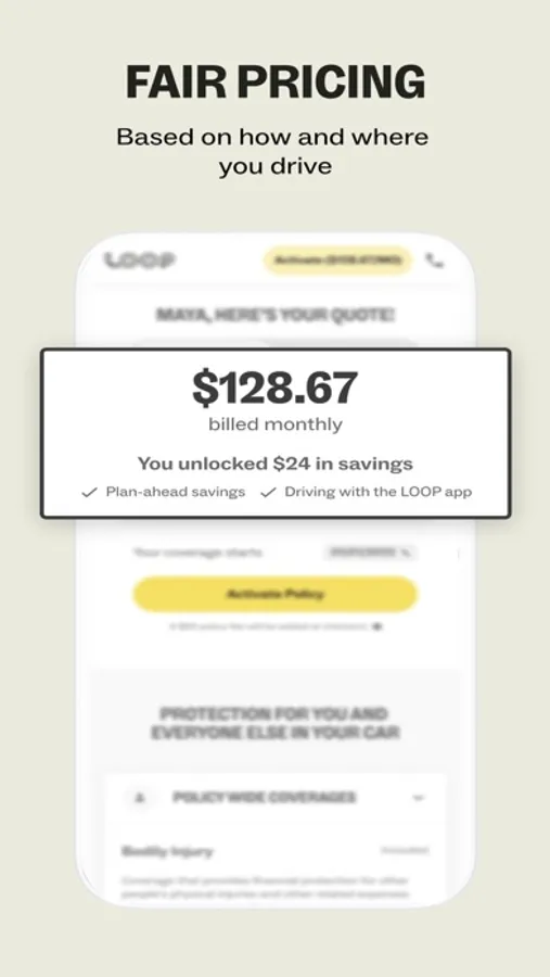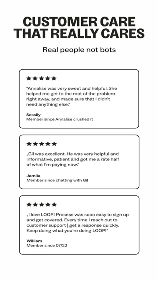 Download the LOOP app to get your car insurance quote in 60 seconds, get fully insured in 5 minutes, get personalized safety tips, access your digital insurance card, policy documents, and so much more.