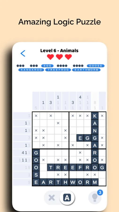 Welcome to Nonogram Words – an addictive logic puzzle game that offers a brand new gaming experience. Enjoy logic number puzzles that combine classic nonograms with crosswords. Fill the grid to reveal hidden words and solve crossword puzzles. With enhanced nonogram gameplay, it's easy to exercise your logic and enrich your vocabulary at the same time!