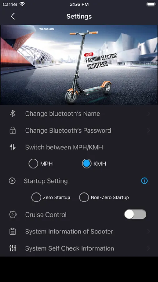 Configure the scooter Bluetooth name and password.Control the scooter light.Set the maximum speed, driving force, steering sensitivity to make riding more safety.
