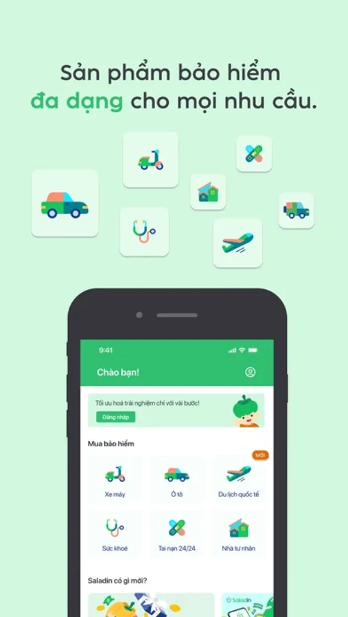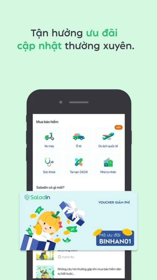 Saladin giới thiệu và cung cấp các gói bảo hiểm (BH) cho tài sản của bạn (như BH xe máy, BH xe ô tô, BH nhà ở, v.v.), BH sức khỏe, và các sản phẩm BH phi nhân thọ khác (như BH chuyến đi, BH du lịch, v.v.), các sản phẩm bổ trợ khác từ các nhà bảo hiểm và nhà cung cấp mà Saladin liên kết, hợp tác.