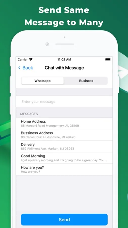 WhatsDirect uses the official public API available from your Whatsapp app. This app is not associated with Whatsapp in any way. Whatsapp is a registered trademark of Whatsapp Inc. You should follow Whatsapp's terms & conditions while sending messages through WhatsDirect App. Any unauthorized downloading or re-uploading of contents and/or violations of Intellectual property rights is the sole responsibility of the user.