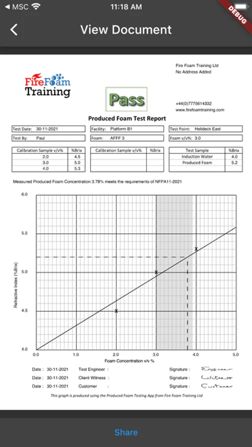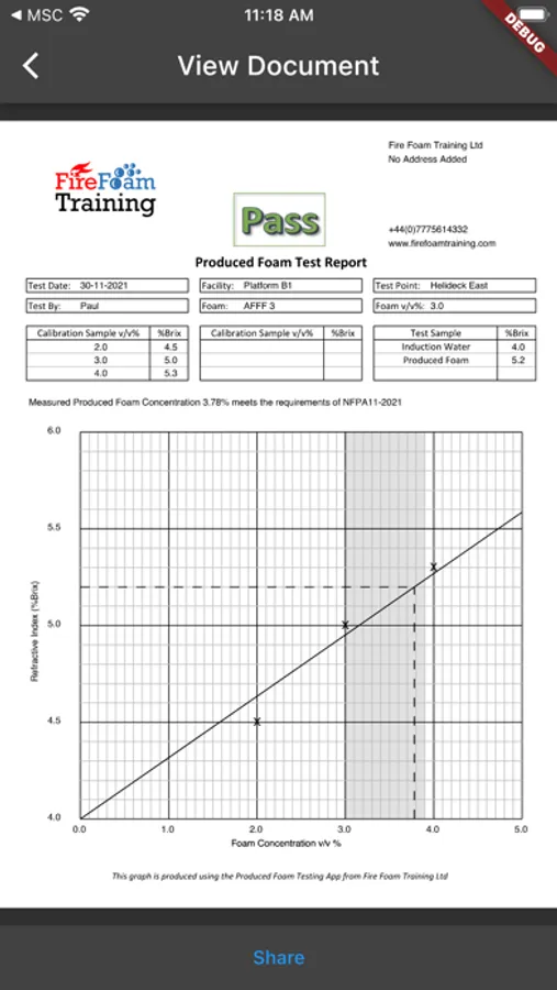 This app assists with the field testing of firefighting produced foam (finished foam) from proportioning systems covered by key International Standards from NFPA, BSI, ICAO and IMO and also allows the user to create their own test Standards. Using the produced foam testing method from NFPA11:2021 Annexe D, the app allows the user to generate the best fit calibration line from Refractive Index, Refractive Index (%Brix) or Conductivity measurements taken from standard solutions and then determines the foam concentration from the produced foam measurement. The app will assess whether the foam concentration is within the allowable range of the selected Standard and generates a one page Produced Foam Test Report that can be customised to include the testers company information and saved, emailed or printed. Test data can be saved in the app for future reference and the app includes helpful site testing tips which are an extract from the Produced Foam Training Course offered by Fire Foam Training Ltd. The app allows up to ten tests to be executed and an in-app purchase is available allowing unlimited tests that can be saved and allows the generation of Produced Foam Test Reports.