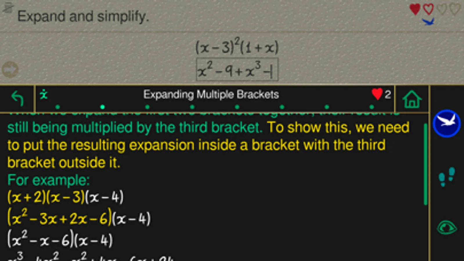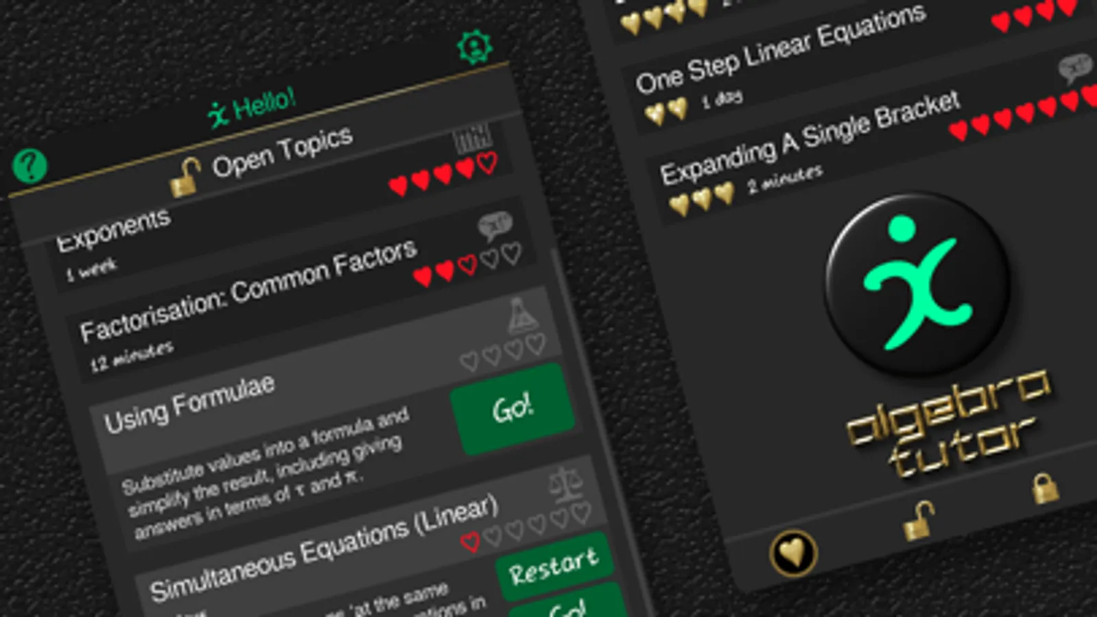 You’re in control of your own learning with Algebra Tutor - once you have mastered tasks in a section, you can choose when to move on. Topics have between 3 and 7 sections each, plus a revision section once completed - if you’d like more practice, or a refresher, topics can be restarted any time without losing your progress.