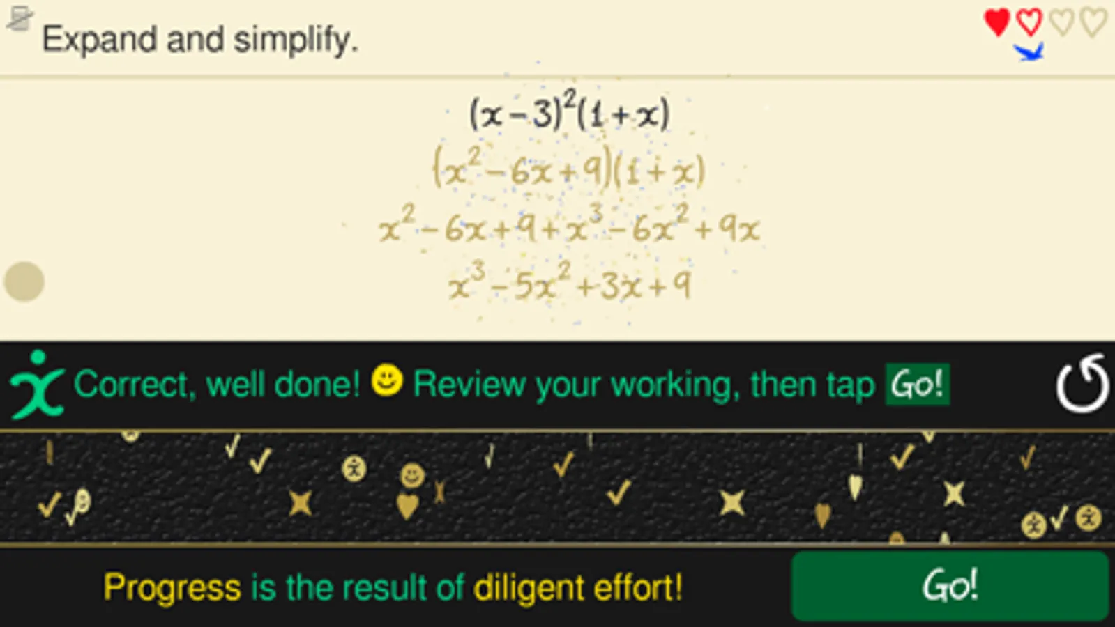 Most tasks involve some form of algebraic manipulation, with the start of some sections also presenting important information and explanations along with a variety of multiple-choice style tasks. To help you develop your long-term memory, prompts to revise topics are displayed in the completed topics list at increasing time intervals after each completion of a revision section.