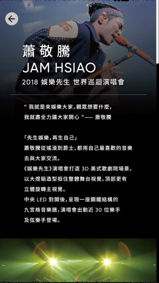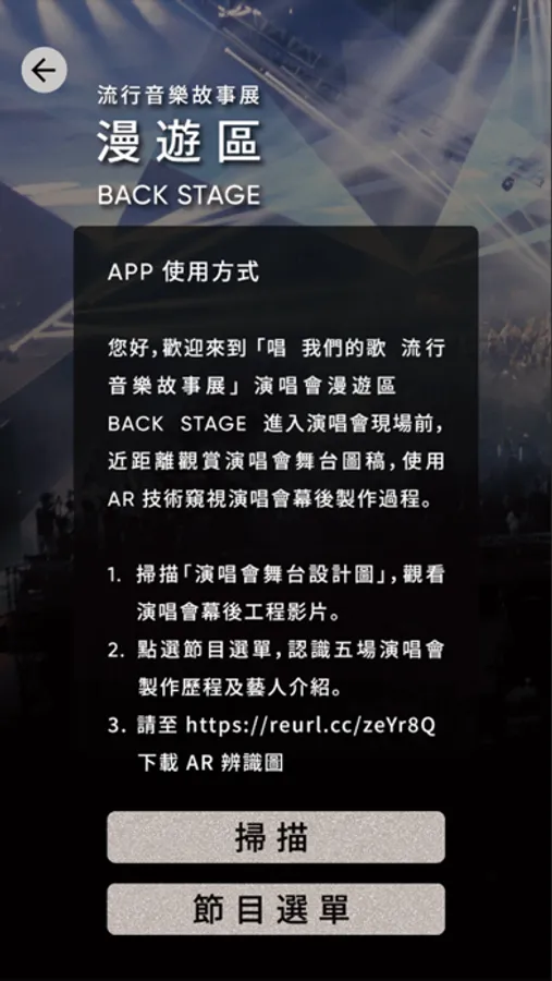 本程式應用於臺北流行音樂中心文化館常設展「演唱會展區」,民眾可利用個人行動裝置開啟本程式後,掃描現場辨視圖像,進行AR 體驗,窺視一場演唱會幕後製作過程。