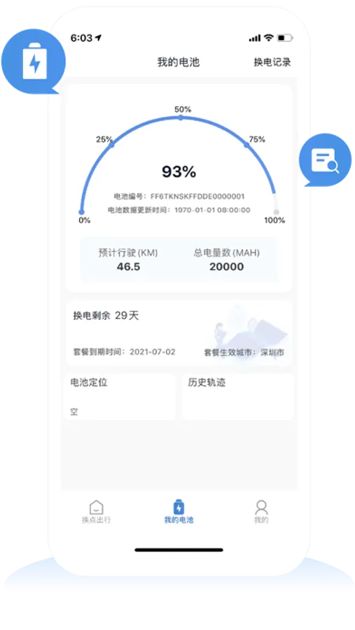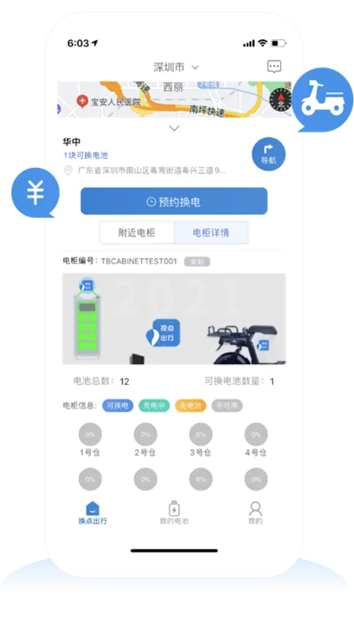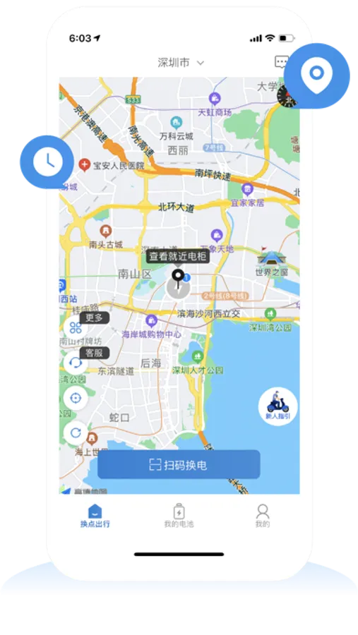 换点出行是由深圳云动未来科技有限公司开发的应用,在安全电池的基础上,构建以自助换电柜、移动APP和物联网大数据云平台整套的智慧出行解决方案。