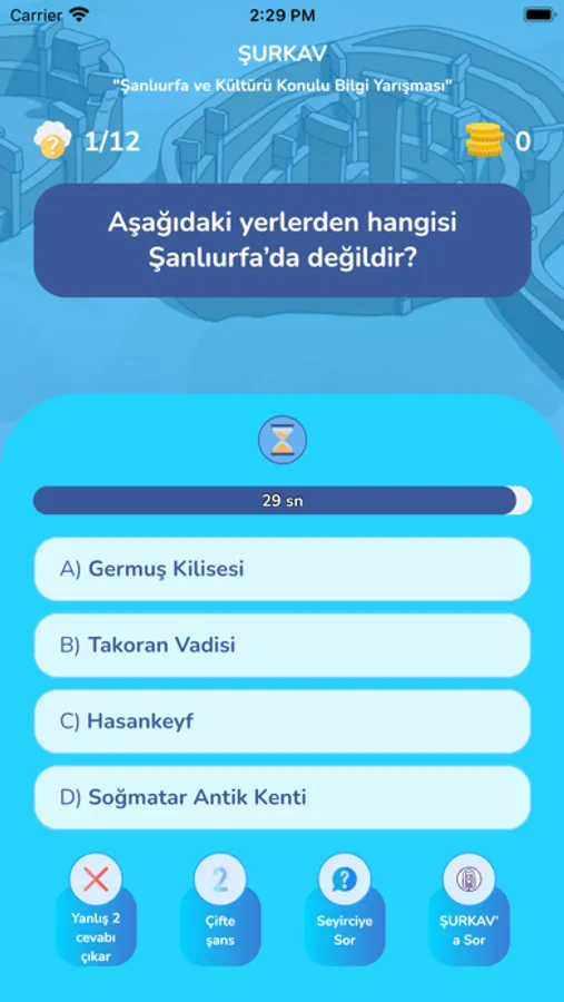 ŞURKAV Kültür Bilgi Yarışması Şanlıurfa ilimiz ile ilgili yeni nesil bilgi yarışmasıdır. Şanlıurfa ilimiz sanat ve kültür anlamında tarihte çok önemli bir yere sahiptir. Şanlıurfa’nın kültürünü ve tarihini ne kadar iyi bildiğinizi sınayabilirsiniz. Bilgi Yarışması 12 sorudan oluşuyor. Özenle seçilmiş geniş soru havuzu ile her oyunda farklı sorular sizleri bekliyor. 4 adet joker hakkınız bulunmakta. Özel olarak Şurkav joker hakkınız ile reklam izleyerek 1 joker hakkına daha sahip olabilirsiniz.