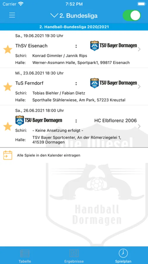 - Heimspielkalender zur Anzeige der nächsten Heimspiele aller TSV Bayer Dormagen Mannschaften