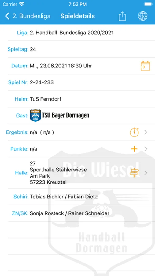 - Details zu einem Spiel (z.B. Datum, Uhrzeit, Halbzeitergebnis, Schiedsrichteransetzung, Hallenanschrift etc.)
