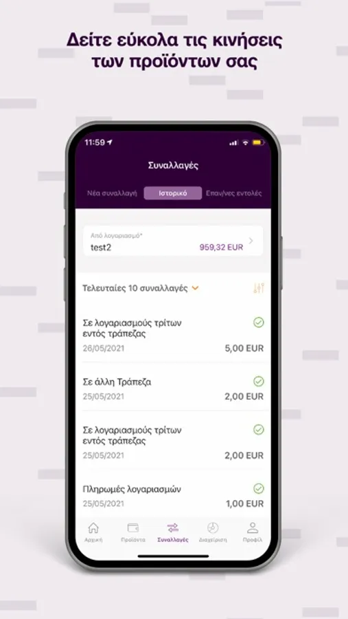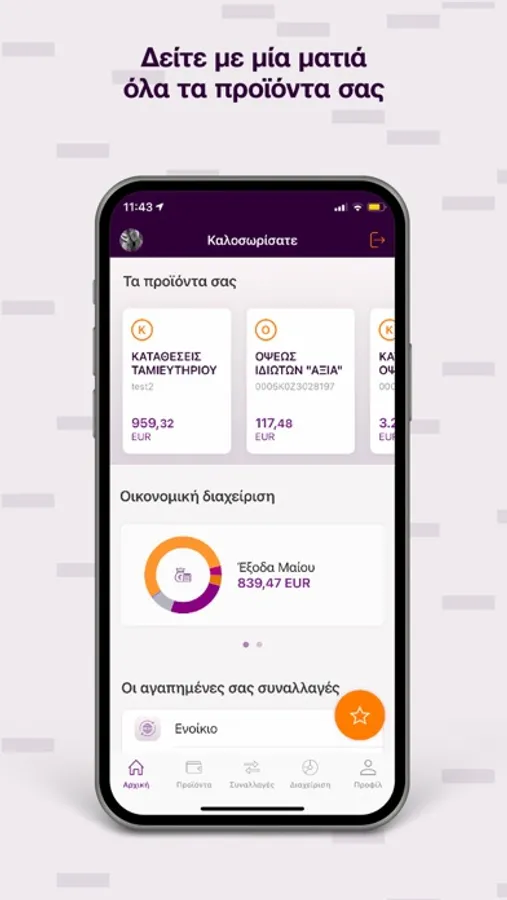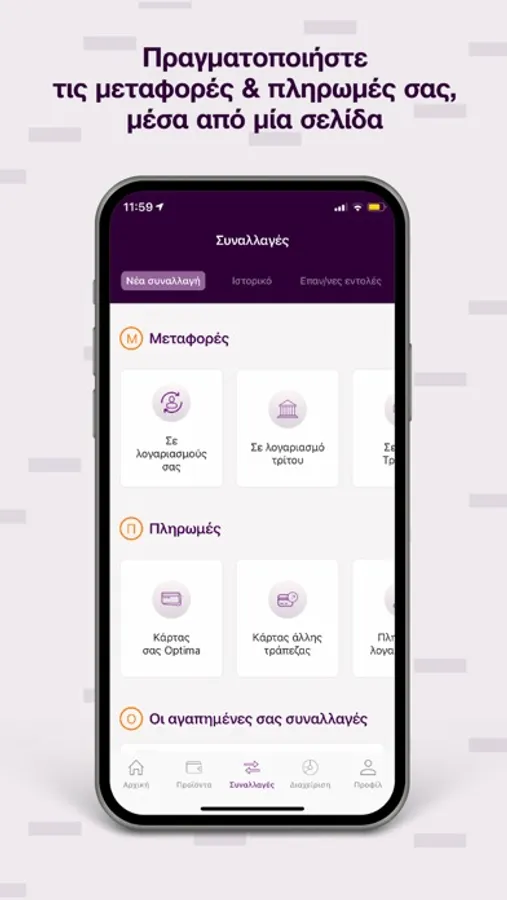 Γρήγορες συναλλαγές: Μεταφέρετε τα χρήματά σας εντός και εκτός της τράπεζας, σε Ελλάδα και εξωτερικό, με λίγα μόνο clicks. Αποκτήστε πρόσβαση σε όλους τους οργανισμούς / φορείς λογαριασμών πληρωμών για να εξοφλήσετε άμεσα τις υποχρεώσεις σας. Αποθηκεύστε τις μεταφορές και πληρωμές που πραγματοποιείτε πιο συχνά.