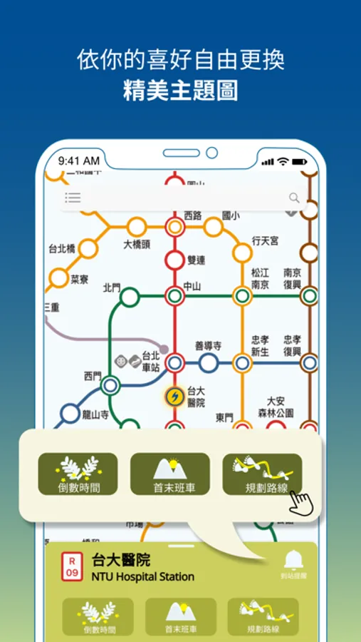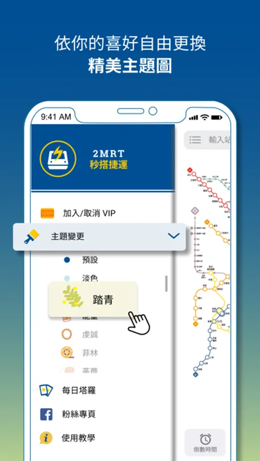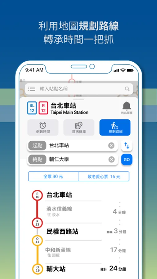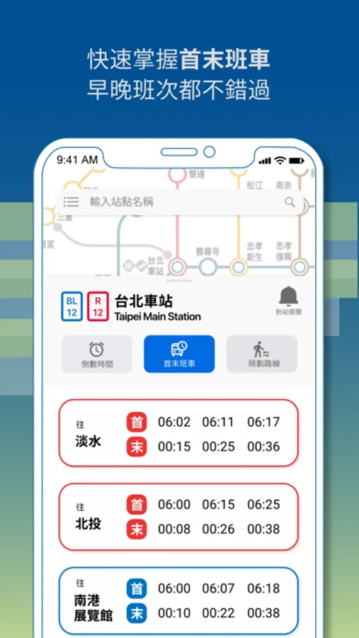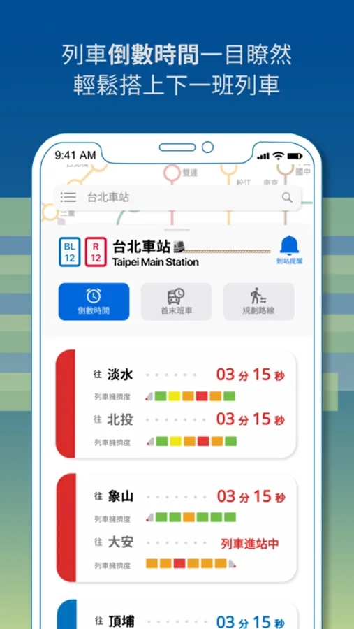 - 倒數時間:查看最近一班捷運的時間。