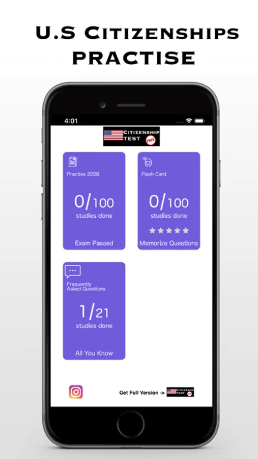 You can access 2020 (128 questions) and 2008 (100 questions) versions of the Civics Tests in our app.