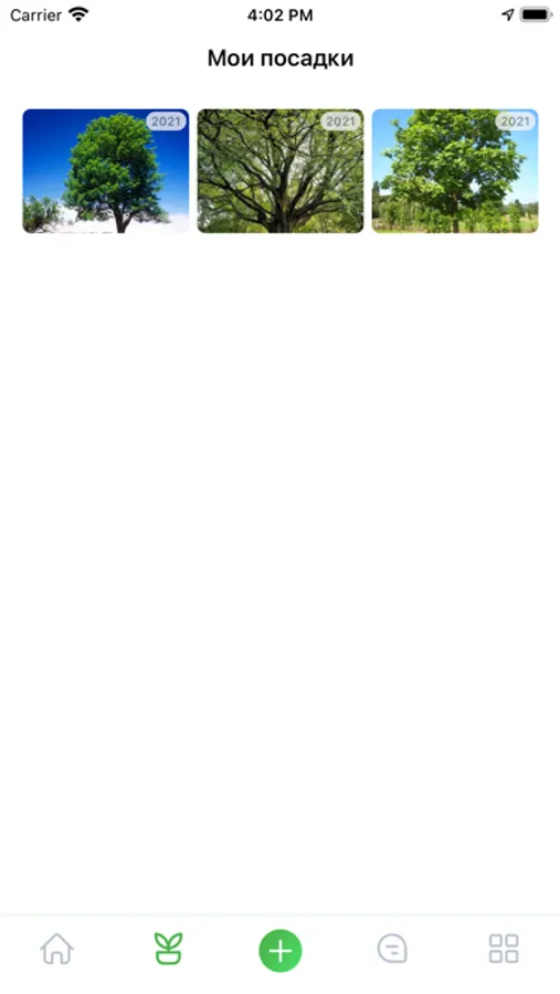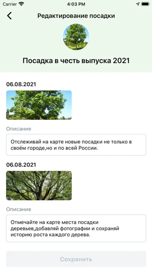 - Добавляйте фотографии деревьев и сохраняйте историю роста каждого дерева,