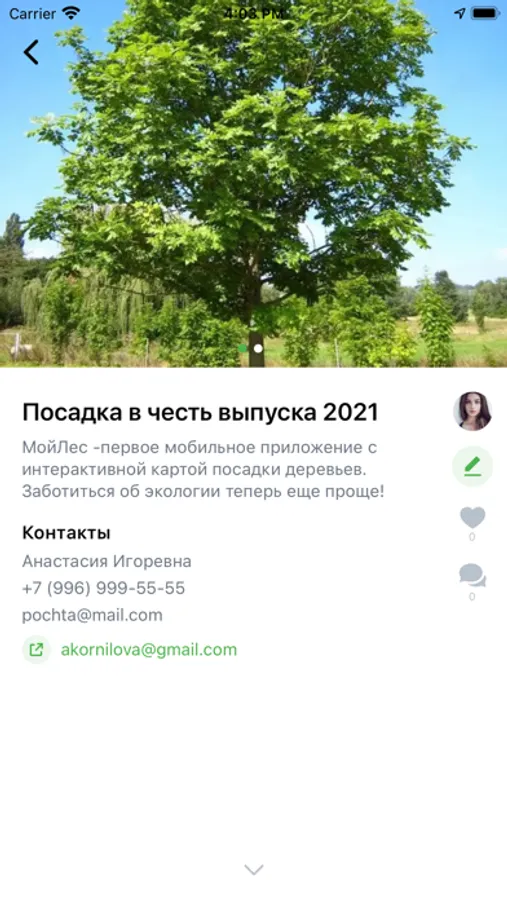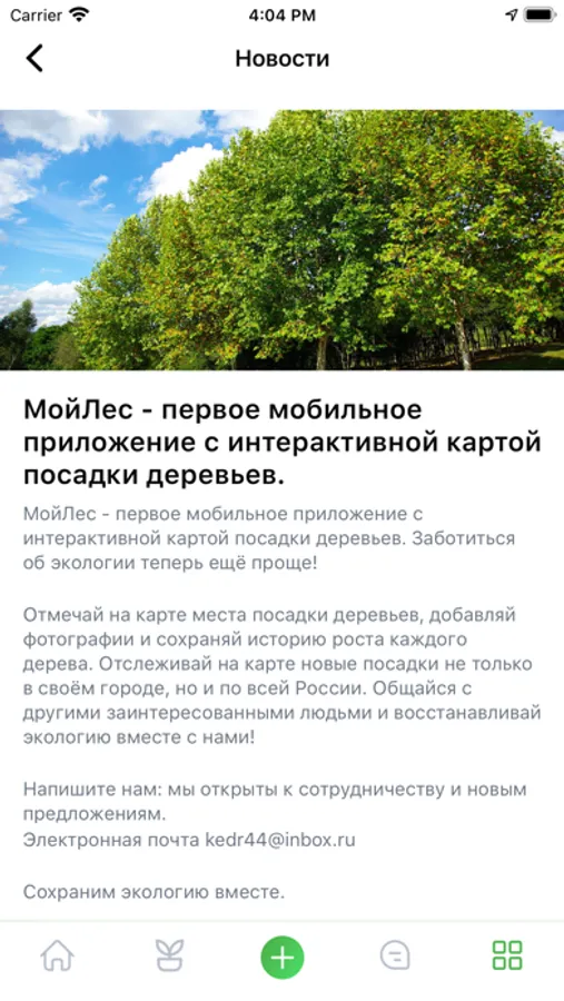 МойЛес - мобильное приложение для людей, которые любят сажать деревья и делиться этой радостью с друзьями. Мы сами посадили уже сотни деревьев и привлекаем к посадкам знакомых, местных жителей, организуем мероприятия по посадке деревьев для школьников, организаций и всех, кому это интересно. Наше приложение – для любителей природы, садоводов и тех, кому небезразлична экология.