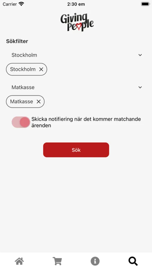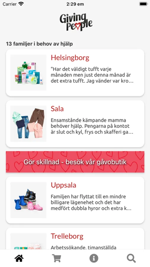 Giving People är en barnrättsorganisation som arbetar med akut hjälp av mat och andra viktiga förnödenheter. Organisationen har sedan starten i september 2013 förmedlat ett stort antal matkassar, kläder, skor och hygienartiklar till barnfamiljer över hela Sverige.