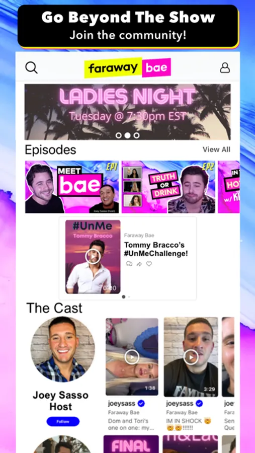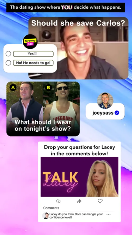 Joey Sasso hosts Faraway Bae, the live dating show where you decide what happens next! Download the free app to interact with the cast in between episodes, vote on the direction of the show, watch the live streamed dates & more!