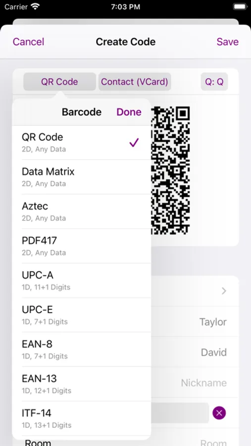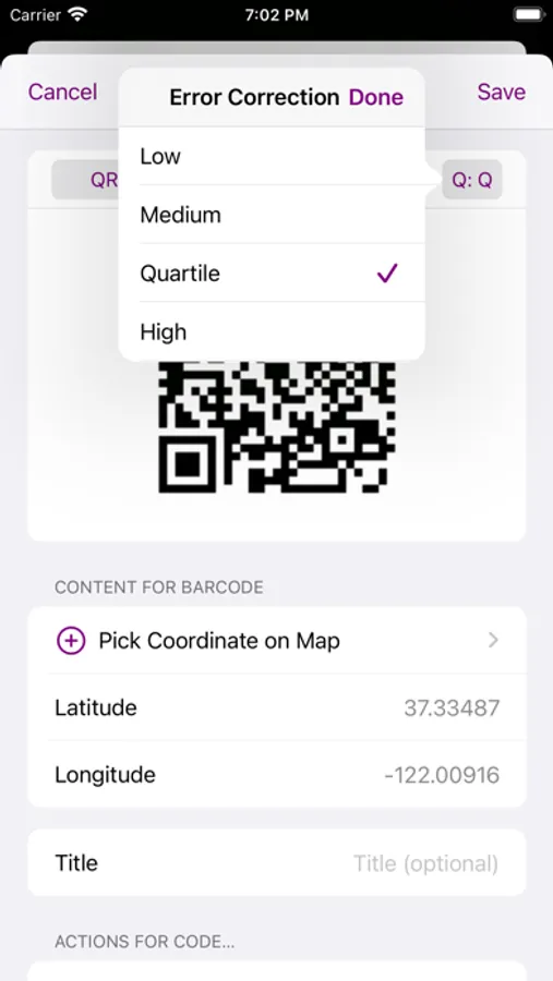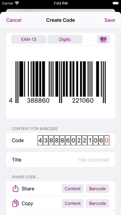 Creating barcodes is very intuitive, easy and fast. You just pick the type of barcode you want to create, its type of content and then either enter the content or pick it from other sources (like the Contacts, a Map, etc). The barcode is updated "live" while entering or editing the content, so there're no additional steps required to actually get the resulting barcode.
