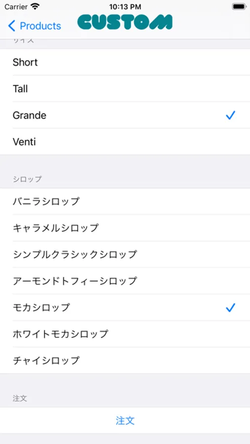 ・Custom画面でカスタムの名前、サイズ、追加するカスタムを選択する
