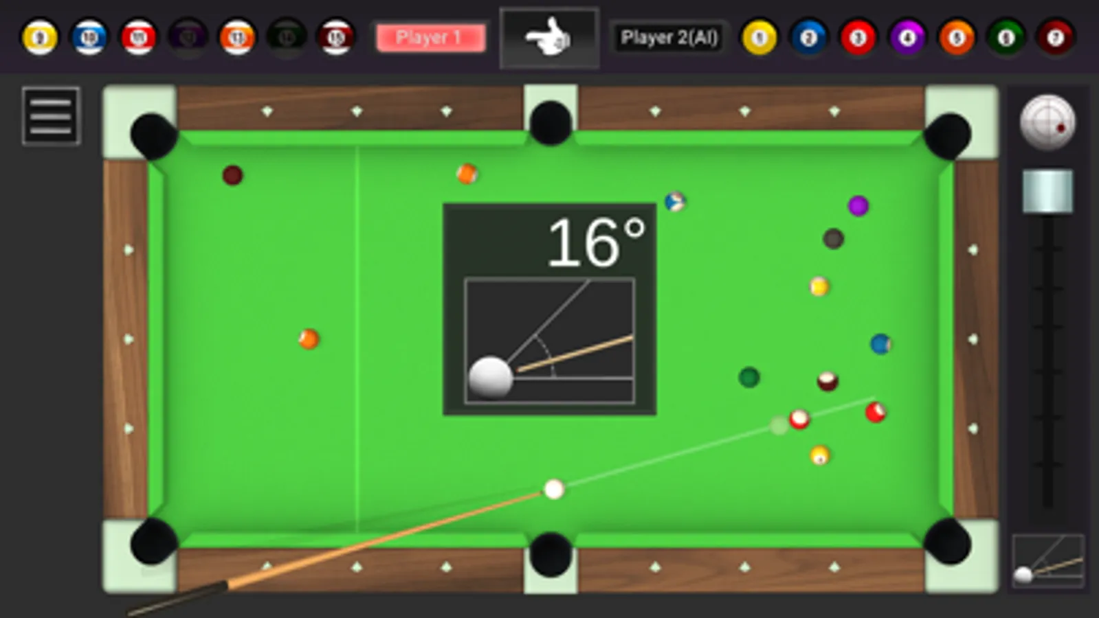 The game has a fairly challenging AI that can very well win in a single run oO. You can use various spin shots for better cueball control; as well as jump shots and swerve shots to reach otherwise unreachable object balls.