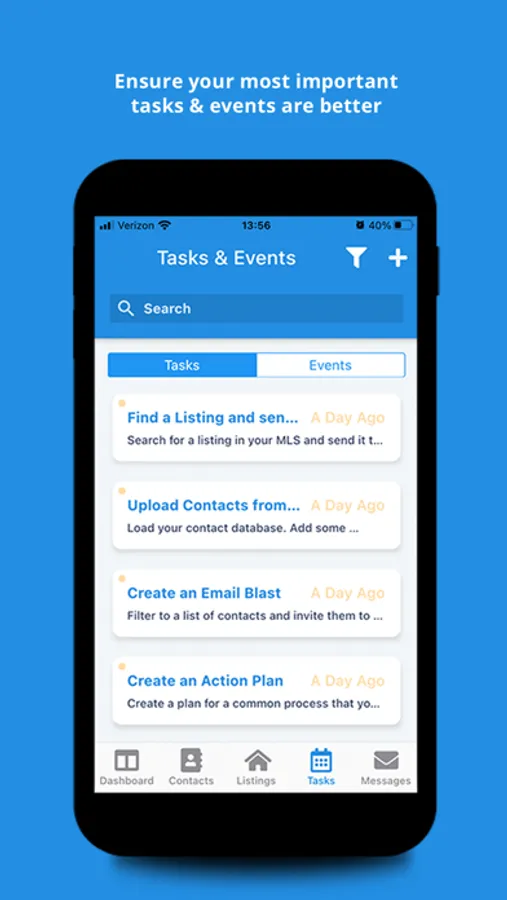 The iPhone app includes a dashboard, contact management, listings, tasks and events, emails and text messaging.